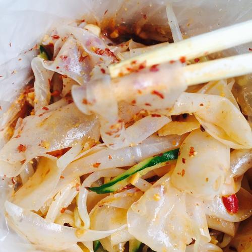 2、米皮皮是用米漿制作出來的。是特別品種的大米泡米、磨漿、蒸制而成。從工藝上看略像廣東的河粉,但口味是完全不同的。